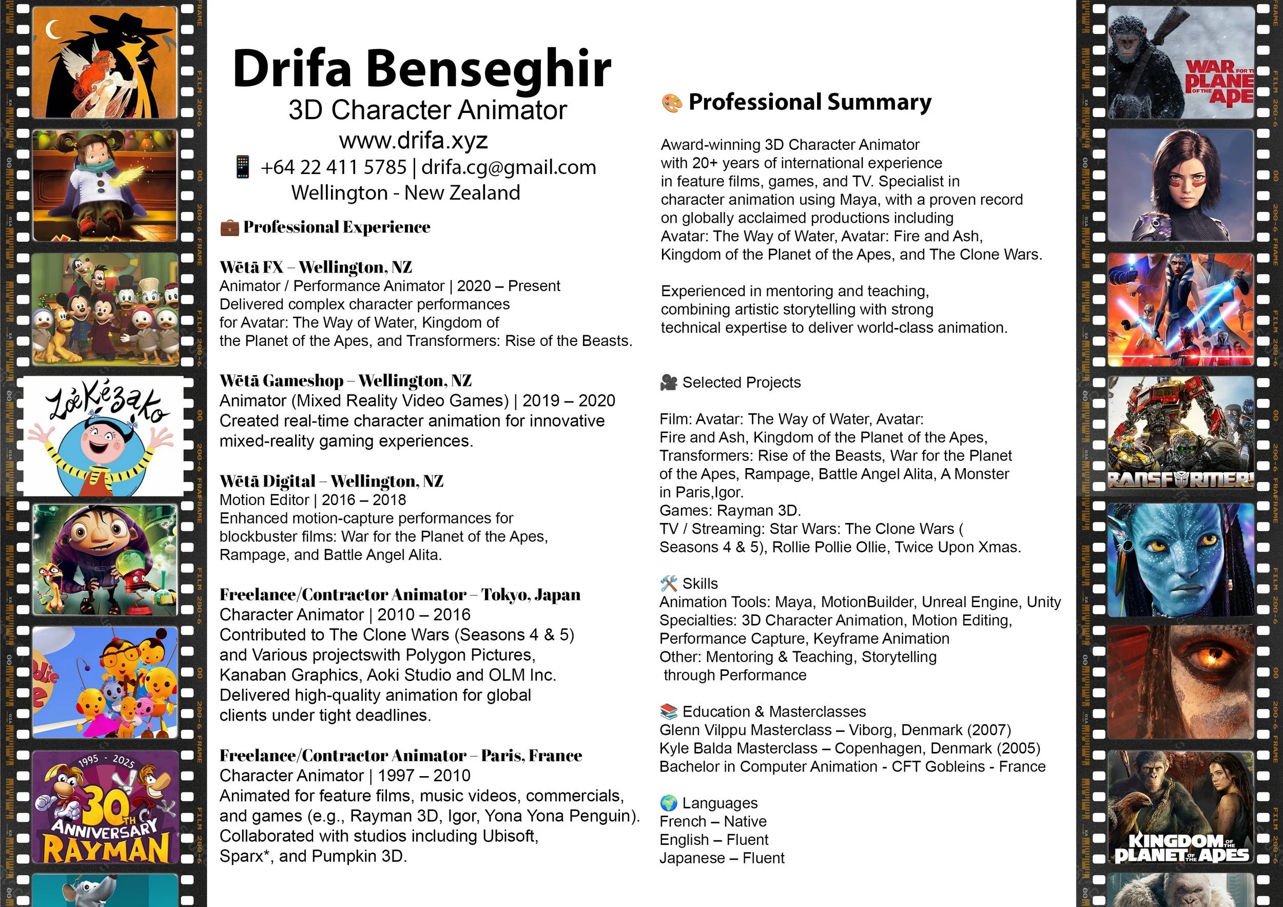 As a Performance Animator at WētāFX, I apply my 3D expertise and passion for animation to create realistic and expressive characters for feature films. I have been working as a 3D character animator for more than 2 decades, and I have contributed to acclaimed productions such as Avatar the way of Water , Planet of the Apes, and Battle Angel Alita.
